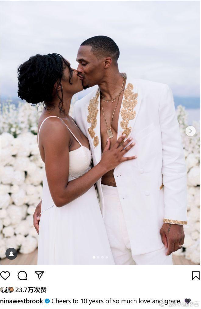 北京时间8月30日,NBA球星威斯布鲁克和妻子更新了社交媒体,两人都晒出10周年纪念日的照片。